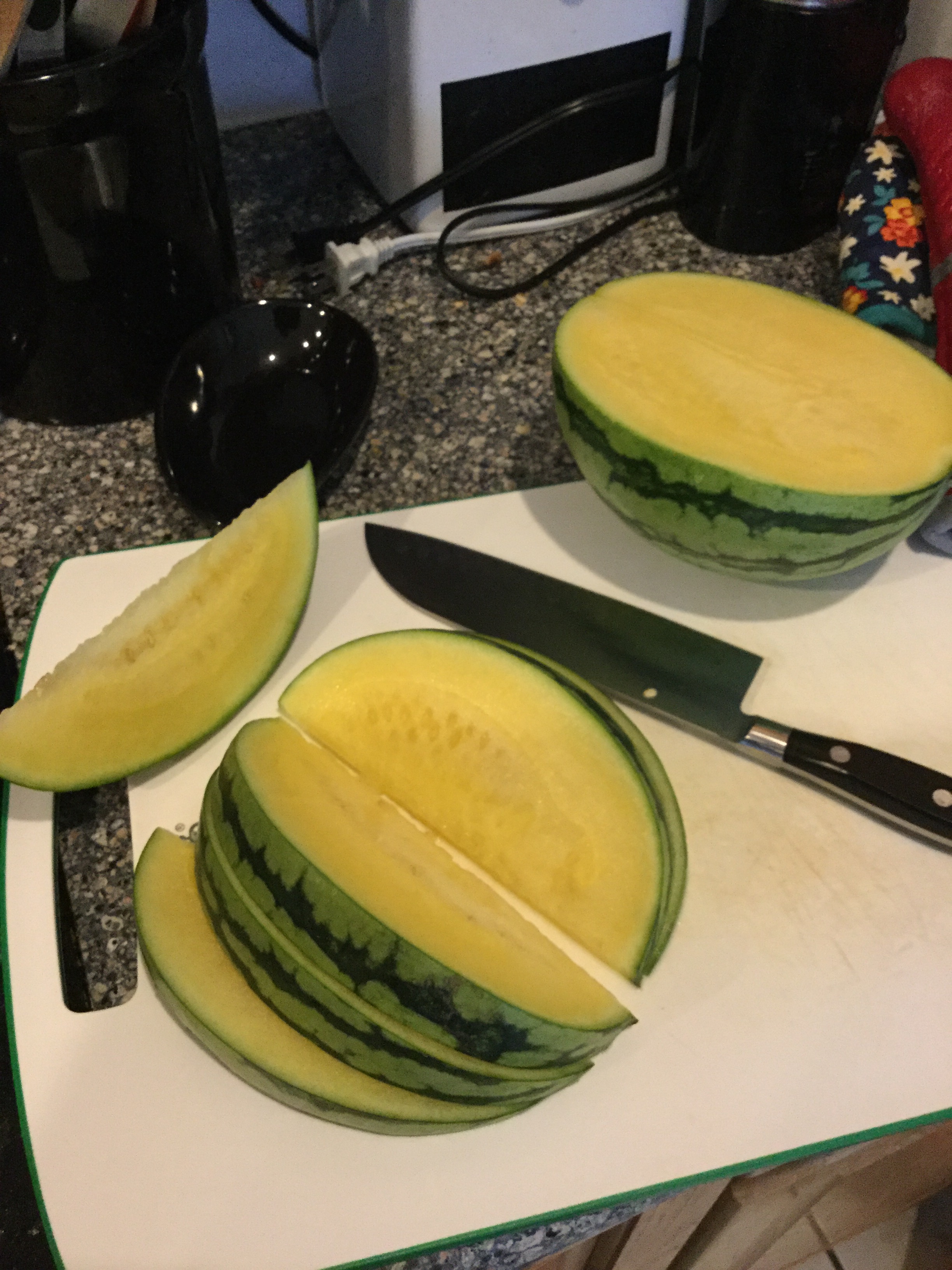 First of all, I need you to know that yellow watermelon is a thing. I did not know this until I cut into the watermelon I bought this morning when the boys got home from camp. It was a bit alarming, but was approved by the two watermelon-eaters in the house.