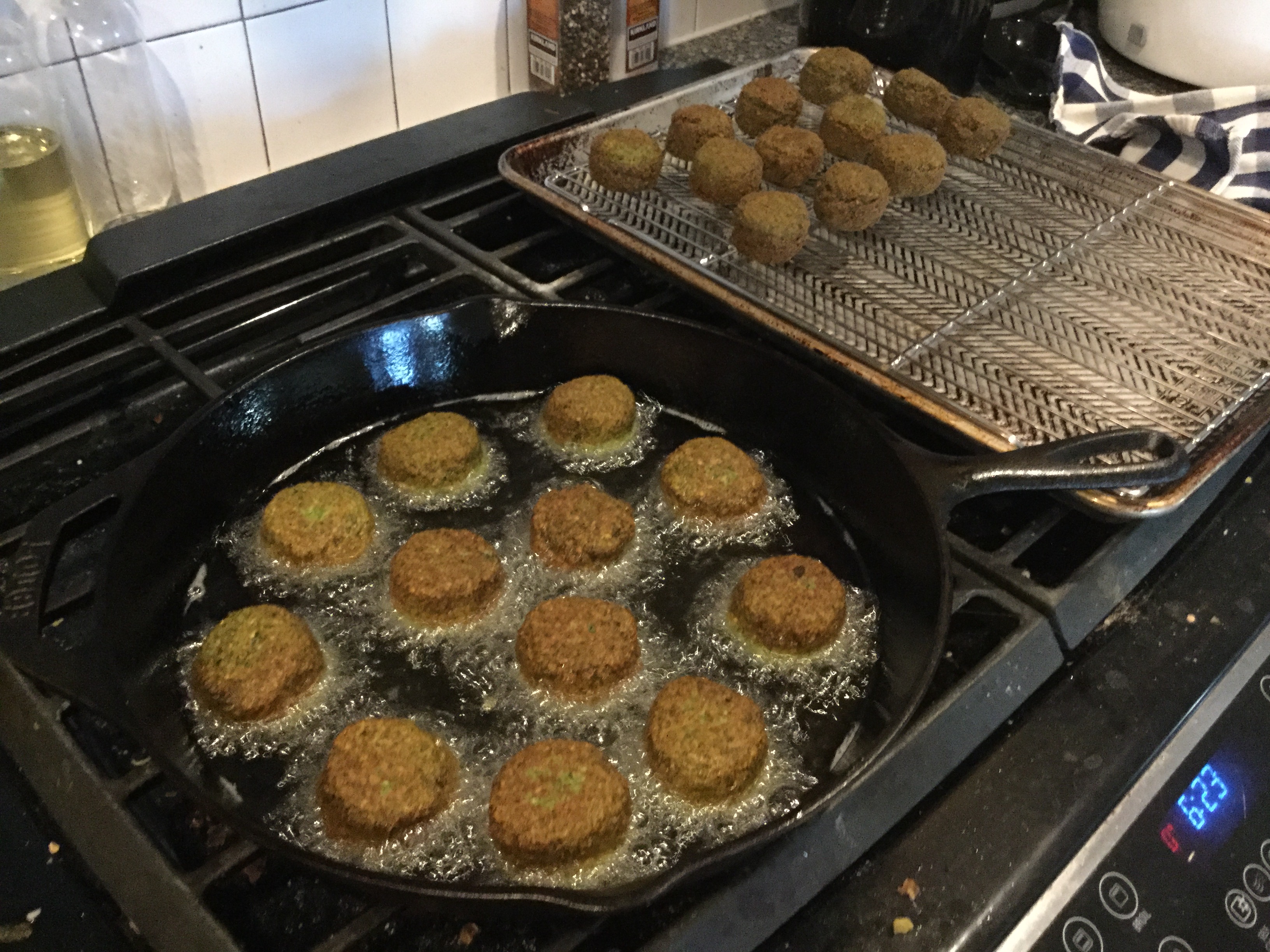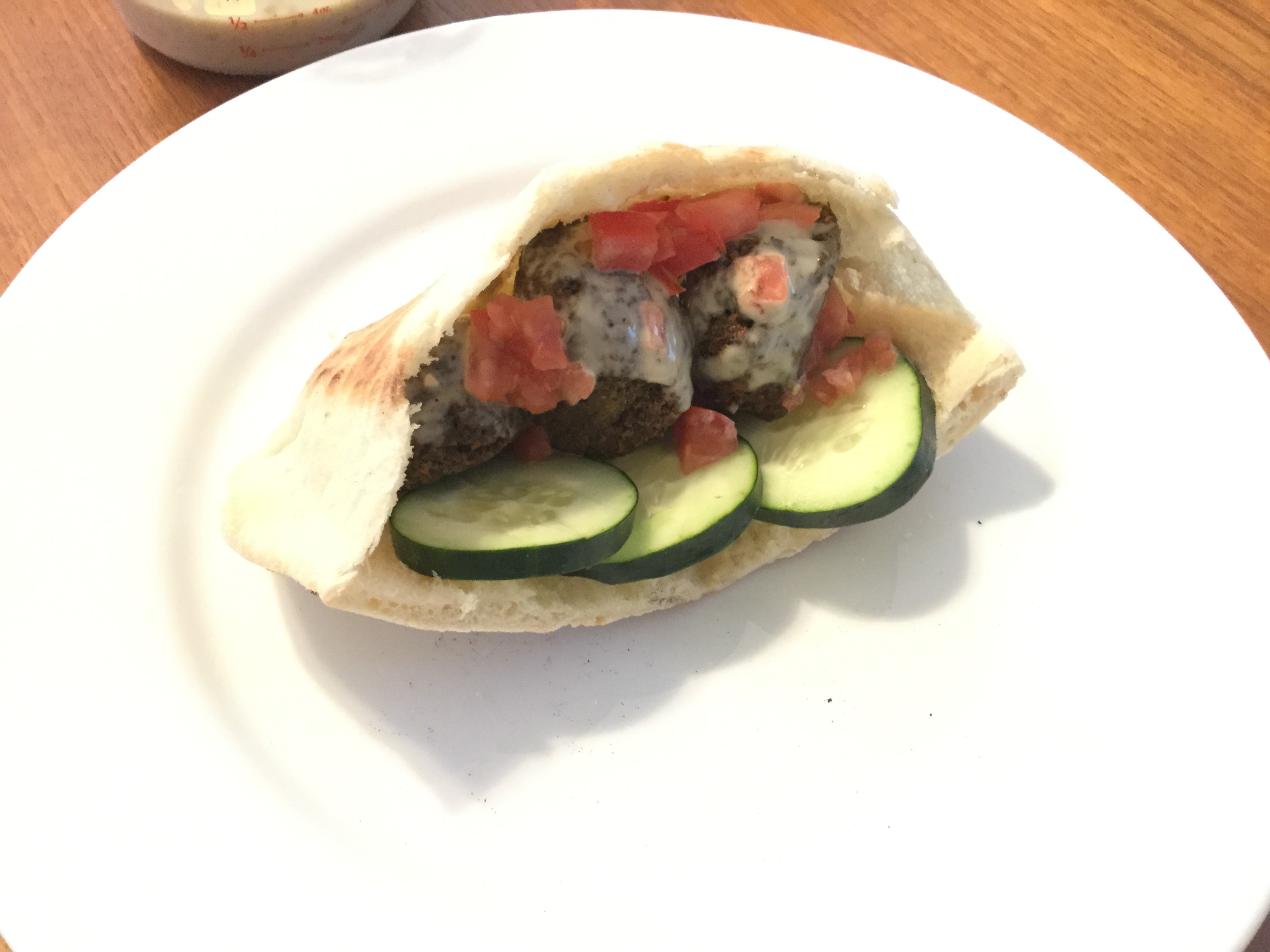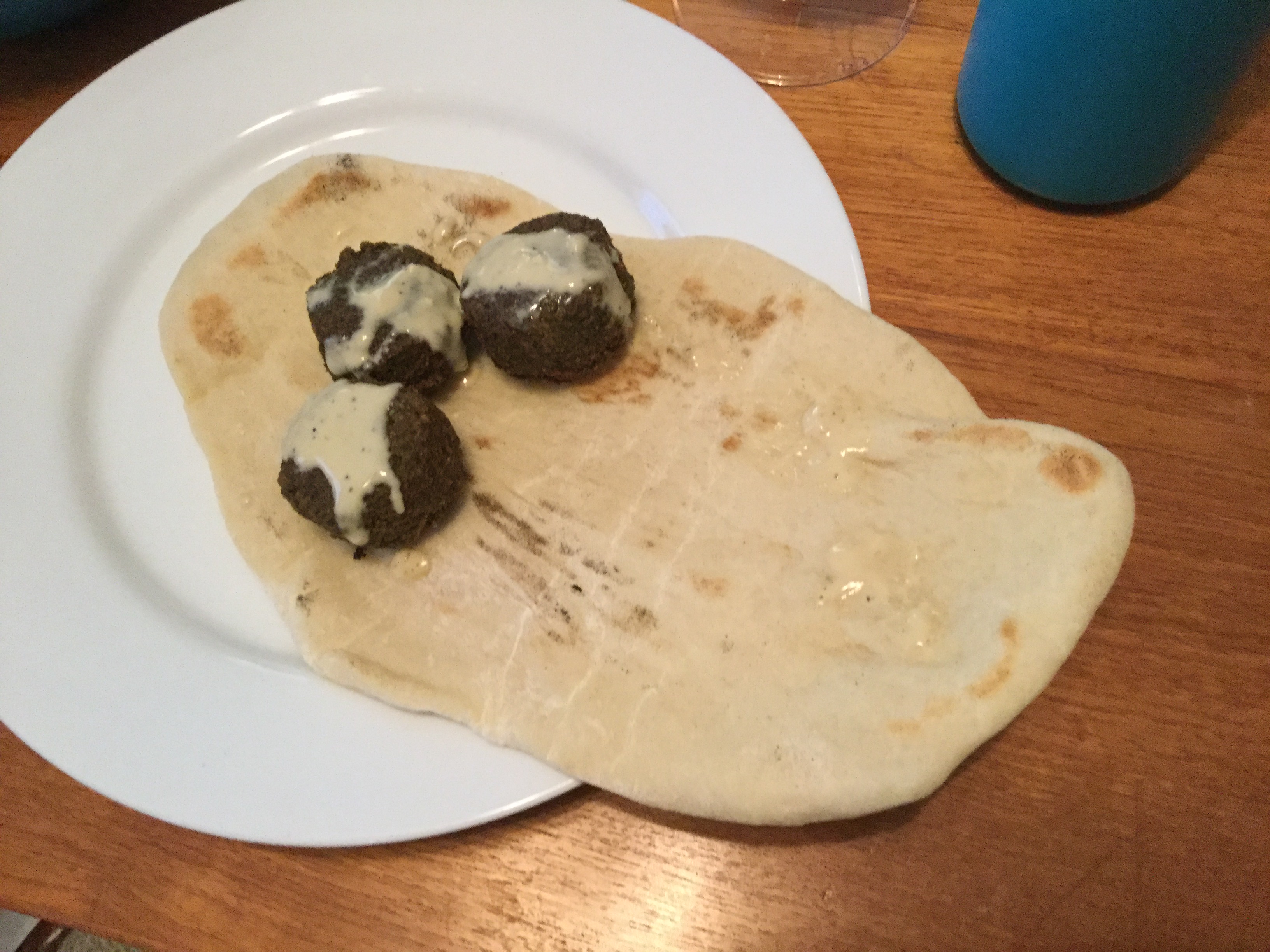 Okay, so I didn’t take enough pictures to take a “Look at this process!” moment, but it was fun to make and it was the best falafel I’ve ever had. Both children enjoyed it and went back for more. The lemon-tahini dressing was amazing. I don’t like cucumbers or tomatoes so I don’t know how those were but the other adults liked them. And the picky child’s face when he bit into the falafel and saw bright green inside was pretty amazing.