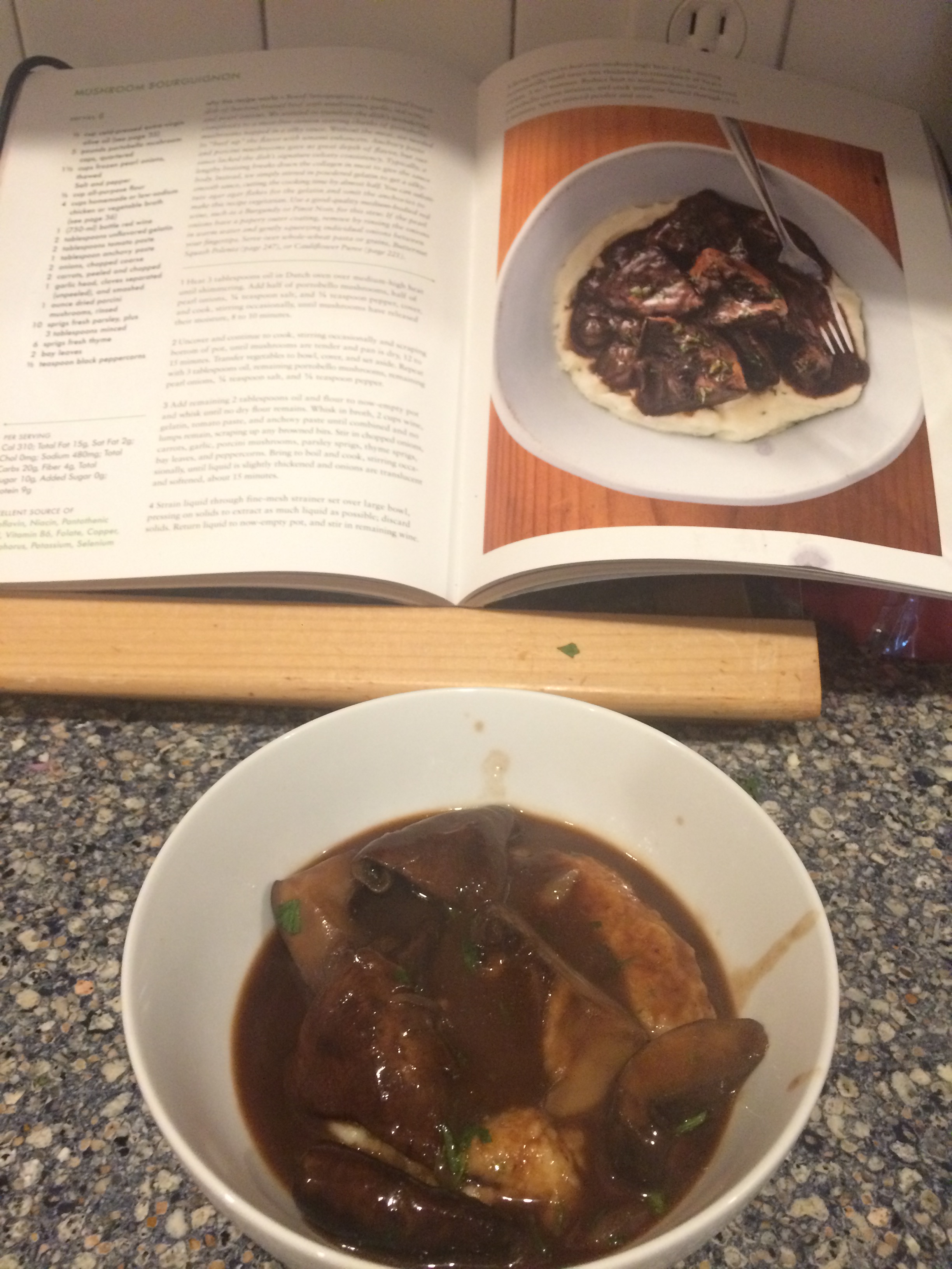 And the mushroom bourguignion was so rich and savory and the sauce really tasted like it could have been made with beef. Technically this isn’t vegetarian because it has gelatin and anchovies, so if you’re actually vegetarian there are instructions for getting around that in the description, but the recipe as-is was good for us as people who are just trying to cut back on meat.