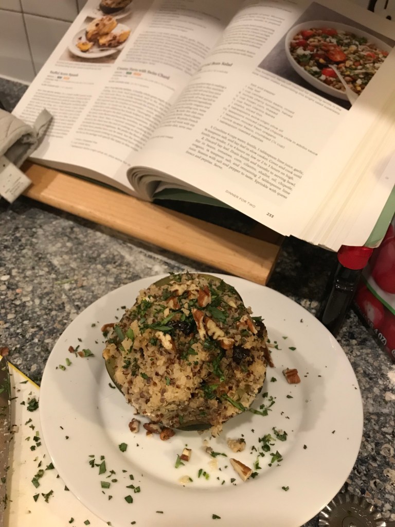 I was very slow on meal planning this weekend because I started my vacation and knew that I could grocery shop on Monday (oh how I missed shopping on weekdays!), but I am grateful for that, because over the weekend someone posted a large box of acorn squash on my local Buy Nothing group. I swiftly searched for an acorn squash recipe I hadn’t tried yet and stumbled across this one. The flavors seemed perfectly wintery and I figured it was less risky to double a recipe designed for two than to try to triple it, so it seemed like a great thing to make while my nephews are away (plus, I didn’t have to field questions about why there was fruit in our dinner).