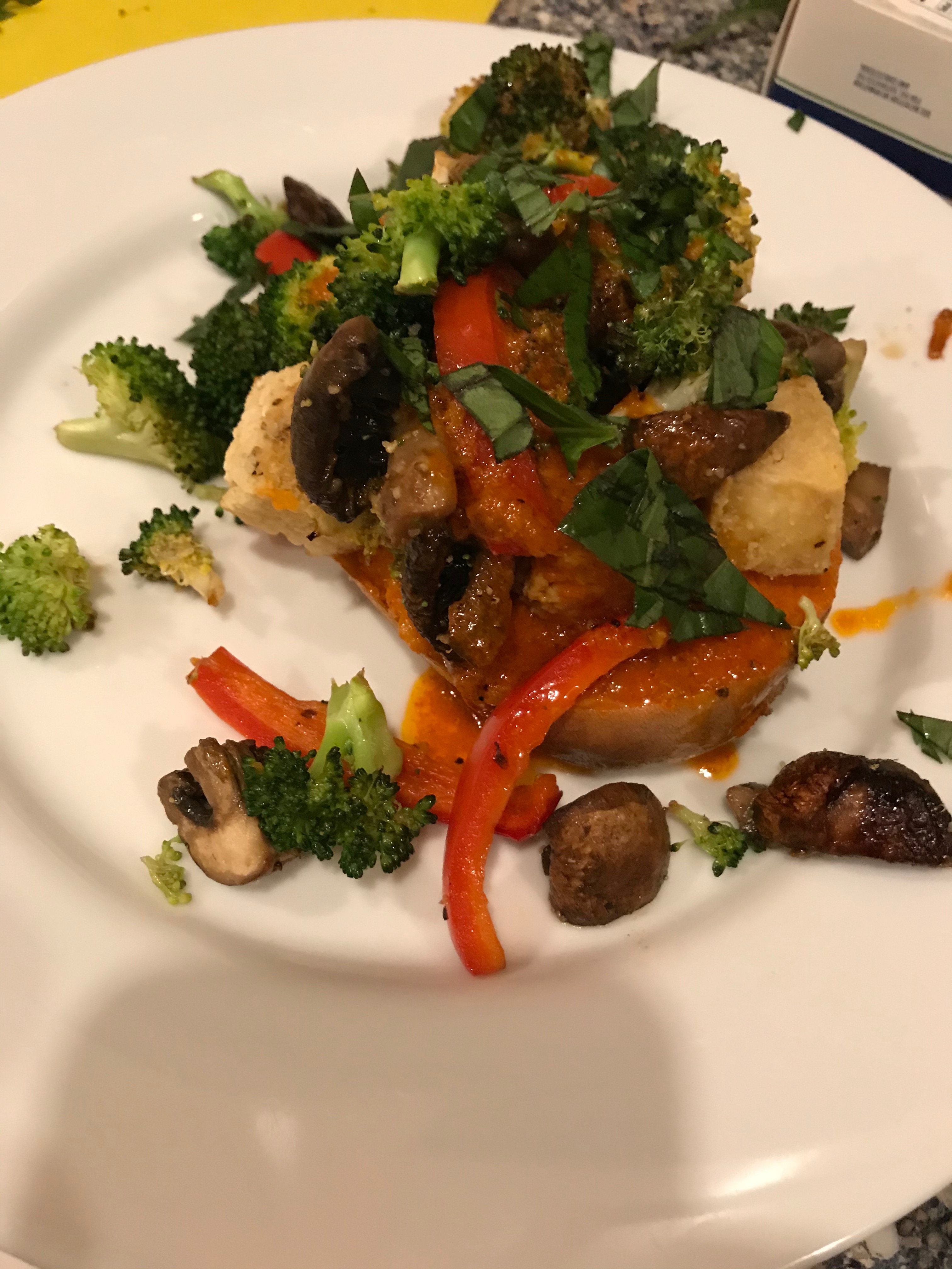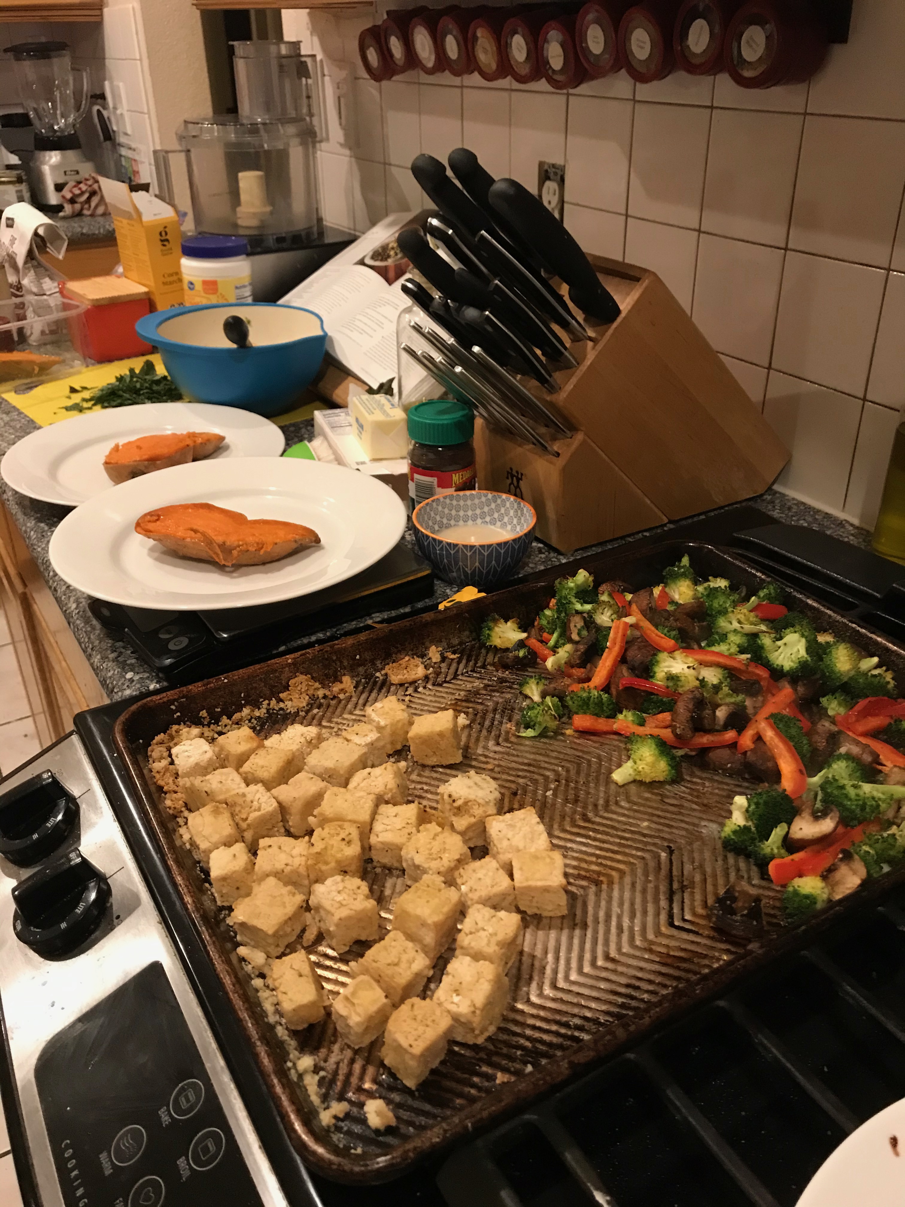 This was our Christmas Eve dinner. I started draining the tofu before I ran upstairs to stream Christmas Eve Mass and then did the rest of the work after dinner, so it’s hard to get an accurate time, especially because that was nearly a week ago. Definitely more than an hour but less than two hours. Prep was pretty easy, so I had some downtime at the end when things were finishing roasting.