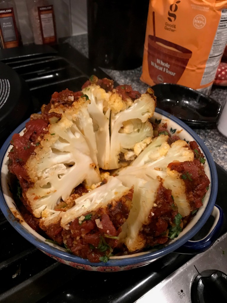 This was our last night of eating without the boys (and actually they came home early so they ate Christmas leftovers that night), and I made it for one of our nights without them because it said it served four, but my cauliflower was only 2.5 lbs instead of 3 and we still ate just over half of it between the three of us. We could have made it serve five, and I think with a big enough cauliflower, it would have served six.