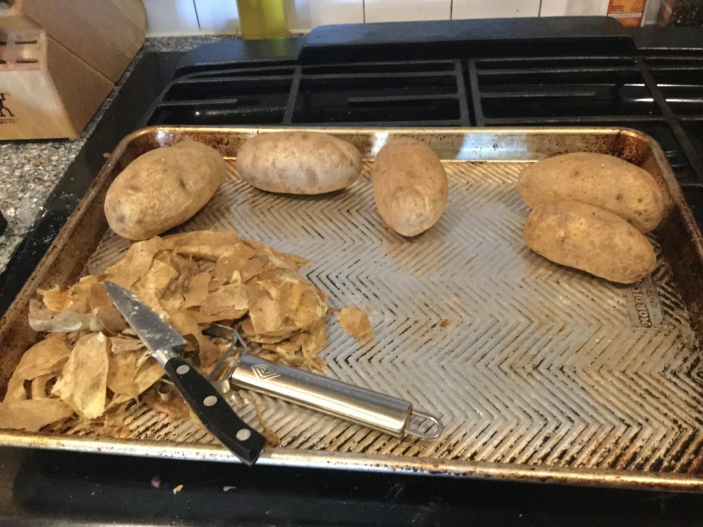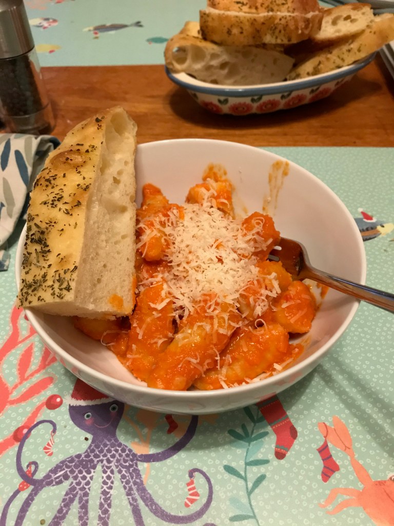 The process for the gnocchi itself was about the same as it always is: bake potatoes, peel and rice potatoes, mix in flour and salt, shape gnocchi, cook a small amount of gnocchi at a time until it floats, repeat. The shaping of the gnocchi was vastly improved (in regards to effort and beauty) by the gnocchi board. The cooking process was impeded by the fact that I decided to flour some of the gnocchi so I could pile it up on the baking sheet without it sticking together, but then the flour came off in the water and the water got thick, thus keeping the gnocchi from floating as readily. So I boiled water in my kettle and did periodic water swaps to keep it from turning into goop without making it cool down too much, and that seemed to work. It’d be better not to flour the gnocchi in the first place, though.